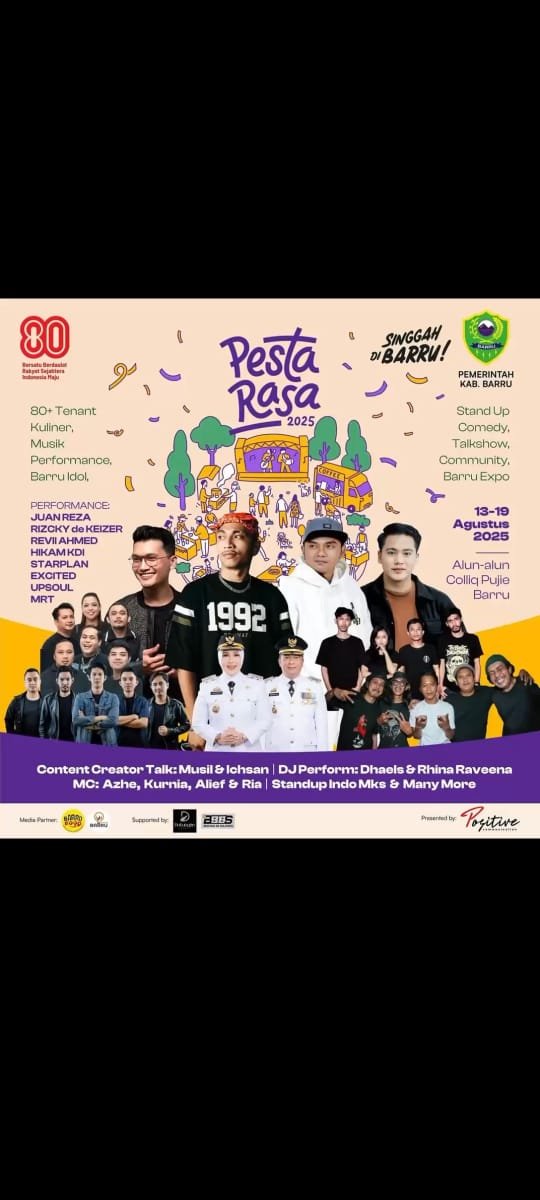 Pedomankita.com, – Barru – Pemerintah Kabupaten Barru kembali menghadirkan event spektakuler bertajuk Pesta Rasa 2025 yang akan digelar pada 13–19 Agustus 2025 di Alun-alun Colliq Pujie, Barru. Mengusung semangat kemeriahan HUT ke-80 Kemerdekaan Republik Indonesia, acara ini siap memanjakan masyarakat dengan rangkaian kegiatan seru dan beragam hiburan.